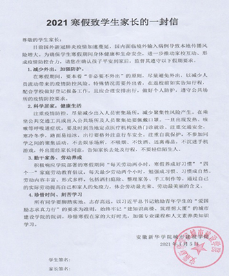 本次发放的“一封信”要求学生安全到家后第一时间与家长联合签名、拍照向学校反馈,目的是既准确掌握学生行踪,又与家长确实取得沟通。经全面排查,截至目前城市建设学院除少数留校考研培训学生外已经全部安全到家;且经电话随访,学生家长览信后均对城市建设学院要求学生利用寒假期间每天“一片洁净空间”“一顿爱心早餐”“一次健康运动”“一个暖心之举”的“四个一”活动倡议表示赞赏和理解,表示会尽自己的最大努力做好督促与引导,和学校保持密切联系,全力支持和配合活动的开展。