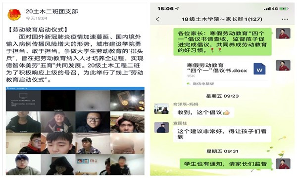 本网讯(通讯员:郑晖)为切实推动学院部署的寒假“四个一”家庭劳动教育活动,充分发挥广大同学和家长的积极性,城市建设学院全体辅导员利用网络平台,在全院范围内以班级为单位举行了寒假“四个一”家庭劳动教育线上启动仪式。