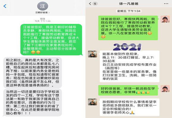 在这短短的两周里,不仅同学们个人的动手能力得到了锻炼,那一道道不甚纯熟但充满孝心的菜肴、一次次不加修饰却饱含亲情的互动,更在无形中增进了家人的情感、凝聚了家庭的温暖。截至目前,已经有家长们看在眼里、喜在心里,欣喜的向学院反馈,自己的孩子真的变了、长大了,对学院的“四个一”家庭劳动教育活动将一如既往地坚定支持下去。