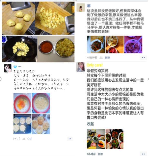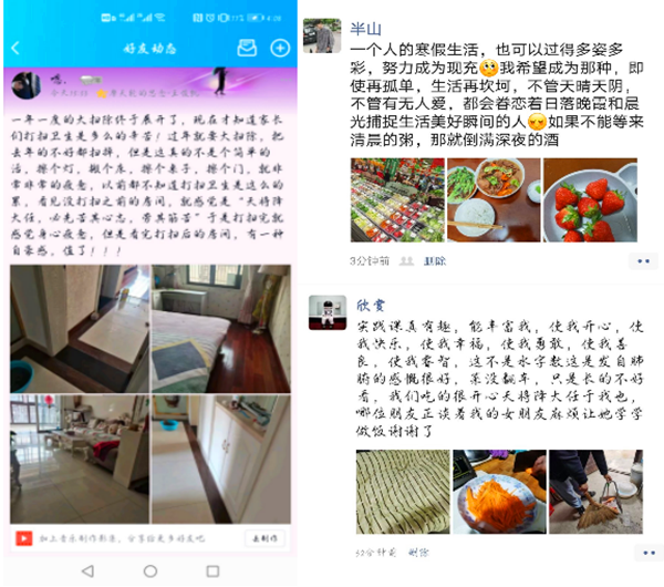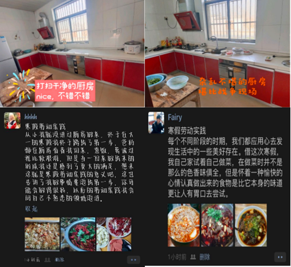 同时,财金学子积极践行“五个一”行动,做好一顿饭、打扫一次卫生、整理一次卧室、清洁一次厨房、清洗一次衣物。在劳动中明白了“一屋不扫,何以扫天下”的道理;在洗洗刷刷中不仅洗去了尘埃,洗去了烦恼,还洗出了幸福和快乐;在整理房间中发现了劳动创造的美好;在贴春联、包馄饨中品尝到了过年的味道,感受到日子的红红火火。