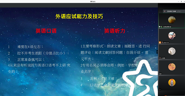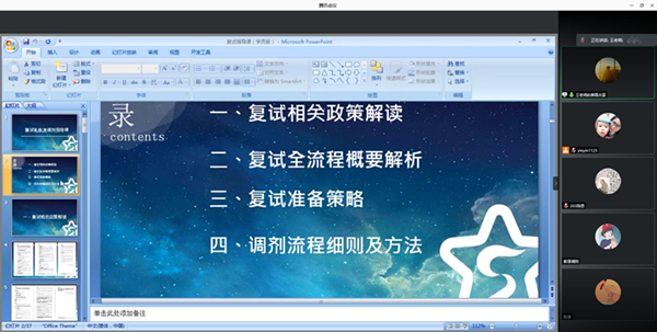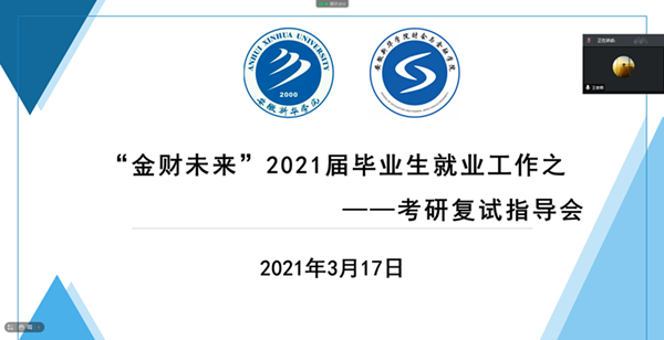 本网讯(通讯员:魏银银)随着考研国家线的公布,为了考研学生更好地备战考研复试,3月17日,财会与金融学院举办“金财未来”2021届毕业生就业工作之考研复试线上指导会。华园考研专家王为科、行政秘书魏银银及有兴趣的考研学生参加了此次线上指导会。会议由魏银银主持。