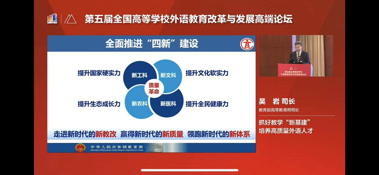 本网讯(通讯员:张丽)为紧跟国家高等教育发展大局,进一步提高教师队伍素养和培养质量,3月20日—21日,外国语学院组织教师在线观看“第五届全国高等学校外语教育改革与发展高峰论坛”直播。此次论坛由北京外国语大学、教育部高等学校外国语言文学类专业教学指导委员会与教育部高等学校大学外语教学指导委员会联合举办。