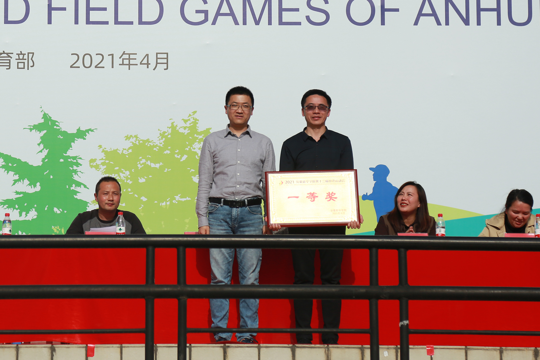 校长助理王琦进为获得团体一等奖的单位颁奖。财会与金融学院夺得本届运动会团体总分一等奖。