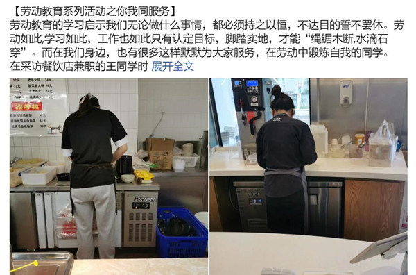 大学生除了学习书本理论知识,还需要积极参与社会实践。为了培养正确的劳动观点和态度,养成自立、自强、艰苦奋斗的良好思想作风,帮助大家直观认识到劳动实践的重要性,我院开展了“你我同服务”劳动教育活动,收集院内同学参与勤工俭学实践的素材,并对其进行积极地宣传、鼓励大家将理论与实践相结合,以实际的方式体会劳动,做到锻炼自己、服务大众。