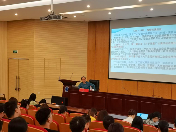 讲座伊始,安广实从经济责任审计的制度背景、法律法规、审计整改等方面展开介绍。他认为,从严治党的关键是从严治吏,参与责任审计的当事人要将规范自身行为放在首要地位。随后,安教授总结经济责任审计的六大问题,其中对“怎样审”和“审计风险”如何管控进行详细探讨,并强调“党政同责”与“同责同审”的关系和“应审尽审”与“把握重点”的关系。最后,他指出在经济责任审计中存在的风险并提出防范经济责任审计风险的措施。整场讲座气氛热烈,学生掌声不断。