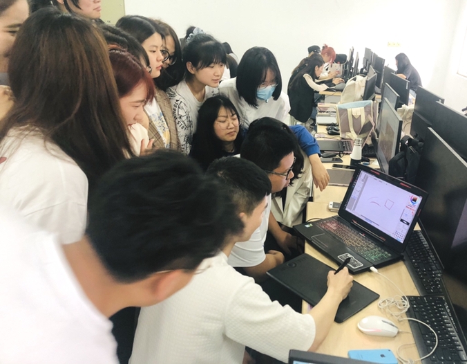 课堂上,设计师与同学们分享公司的发展现状、设计理念,公司原创国潮作品设计的风格与创意表现手法以及与众多知名企业跨界合作的案例作品。在交流的过程中,设计师还把自己近期的项目和同学们分享,希望同学们能够对国潮风格有更全面的了解,而不仅仅是停留在外在的形式上,要学会对传统元素的合理提取与表达。课堂以现场实践,案例分享,作品点评的形式进行,气氛活跃,同学们学习积极性非常高。大家一致认为此次设计师进课堂活动,让他们大开眼界,特别是对国潮风格的表现有更深层次的认识。