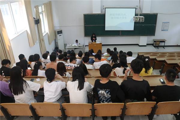 接着,宣誓人代表商学院院长助理团副团长吴节飞发言,他的发言声情并茂、主题突出,为同学们讲解树立诚信意识、秉行诚信行为对营造文明大学环境、培养文明大学生的重要性。