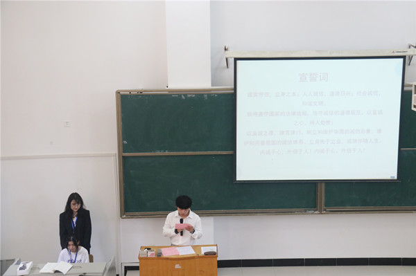 会议开始时,参与活动的全体同学在主持人的带领下齐声宣读诚信誓词。宣读誓词过程中,同学们表情庄重、宣誓声富有激情,展示出我院学子对诚信意识培养的重视和对营造诚信环境的决心。