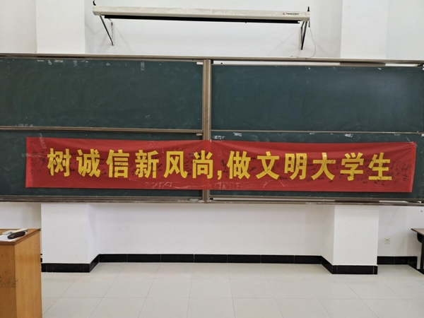 观看完诚信教育视频后,为表现我院学生树立诚信意识、秉行诚信行为的决心和诚意,在商学院院长助理团副团长吴节飞的组织下,全体参加活动的学生在本次诚信教育活动横幅上签名留念。