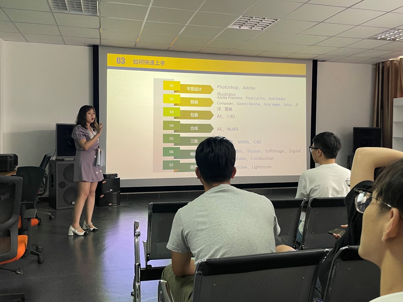 王安雅导演在讲授前沿知识的同时,也用自身参与主持的实际项目及获奖作品进行案例赏析,课堂上学生积极性高,气氛活跃。大量的优质资源分享更是让很多学生入手最为前沿的实用工具。