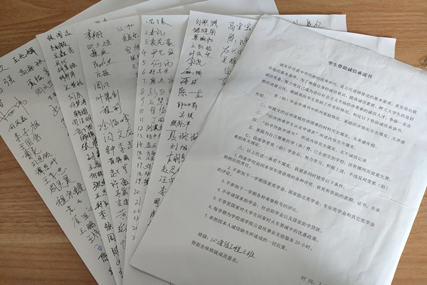 此次活动为期21天。 首先,全院52个在校生班级开展以大学生资助诚信教育为主题的班会。通过观看诚信教育宣传片,多角度向同学们宣传国家各项资助政策和征信金融知识,培养同学们的诚信意识,号召学生们从身边的每一件小事做起,培养诚信的良好道德品质。会上同学们积极讨论,大家纷纷表达自己对诚信的认知。最后,各班级学生签订诚信承诺书,表明自己自立自强、诚实守信的决心。学生们也更加明确自己所应承担的责任和义务。