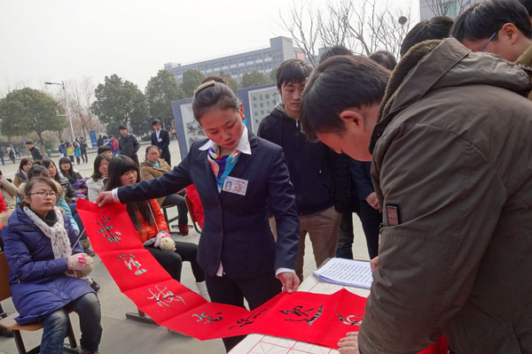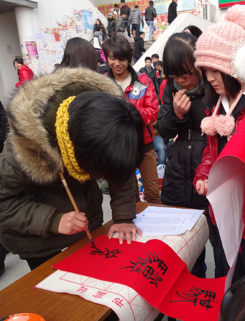 尽管不时有寒风吹打脸庞,但这丝毫没有减少同学们的热情。2012级土木工程管理班的苑青颖同学排在长队中,她说:“这个活动办得挺好的,快过年了,领一副春联回去,贴在宿舍门上,特别喜庆!”