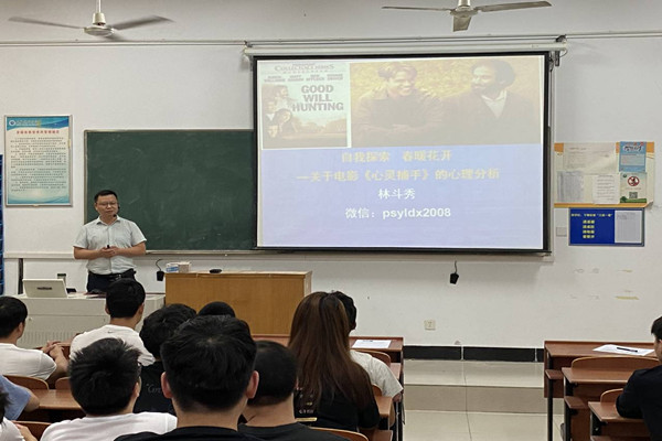 林斗秀以轻松的观众互动开场,随后带领同学们对电影《心灵捕手》的经典片段进行赏析。他用诙谐幽默的语言分析当代大学生在成长过程中出现困扰和迷茫的原因,并通过对电影的介绍以及对主人公成长和成才之路的分析,讲解心理健康在个人成长过程中的意义以及优质的心理咨询的重要作用。