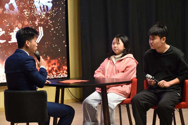 主持人范勇和《追忆似水年华之童年》主创伍思佳、张硕同学面对面交流,两位主创成员向大家分享了影片背后的故事,讲述了他们的创作思路、创作背景、创作经历,以及他们拍摄过程中的心得体会。作为毕业生的伍思佳和张硕,回顾华园四年时光中用自己“镜头”笔触记录春春色彩,感恩母校培养。并且鼓舞学弟学妹珍惜华园时光,以梦为马,不负韶华。