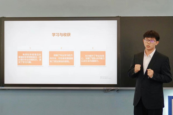 活动伊始,共建班学生代表根据课程特点一一汇报学习成果和学习心得。《DBE财务大数据分析》课程学生汇报表示以场景化的教学模式呈现大数据技术的实战应用、不仅培养了自身的数据采集、清洗、挖掘能力,还提升了大数据分析与辅助经营决策的能力。《集团资金管理实训》课程学生表示在实训操作中学会了重点突出资金支付的安全性和资金预算的精细化管理的技能,对未来更好地帮助企业解决及改善资金管理问题充满了信心。