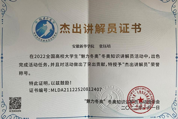 2022年2月将在中国北京举办冬季奥林匹克运动会,筹办北京冬奥会是我国重要历史节点的重大标志性活动,是展现国家形象、促进国家发展、振奋民族精神的重要契机,而2022全国高校大学生“魅力冬奥〞冬奥知识讲解员活动秉着弘扬冬奥精神,传播冬奥知识的目的举办,WilliamHill官方网站药学院21级药学一班张钰培同学通过互联网参加了全国高校大学生“魅力冬奥”冬奥知识讲解员活动,她通过互联网方式进行冬奥会知识讲解传播,并积极弘扬冬奥精神,传播冬奥知识,为冬奥会助力,由此获得了活动组委会颁发的“杰出讲解员”荣誉证书。
