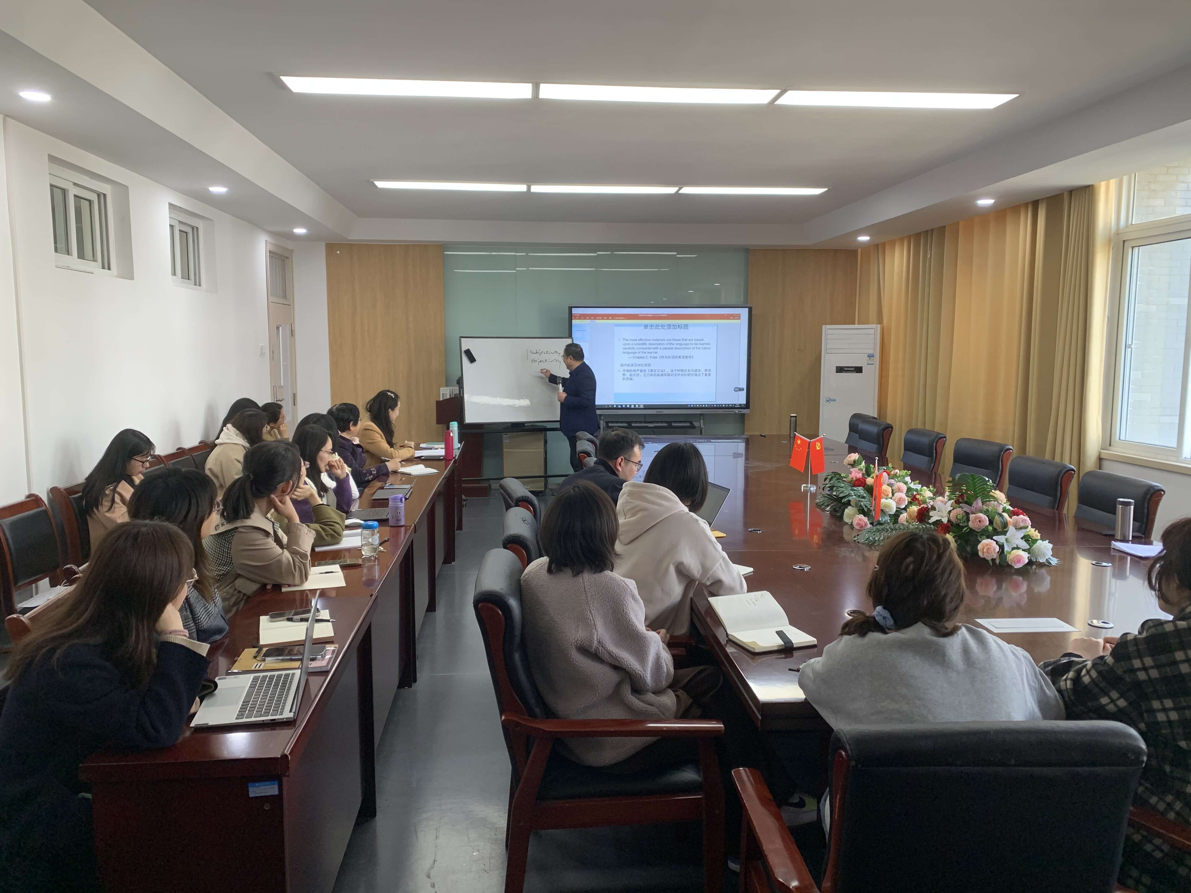 本网讯(通讯员:佘月月)为进一步坚持走内涵式发展道路,夯实师资队伍建设,外国语学院/国际教育学院本学期重点打造“星云学术讲堂”系列活动,以提高学院教师队伍科研能力和水平,加快学院科技创新步伐,推动学院的高质量发展。3月9日14:30在教10-324会议室,学院组织开展了首期“星云学术讲堂”活动,由学科带头人周平教授作了题为“对比语言学:理论与方法”的主题讲座。学院全体教师参加了本次活动。