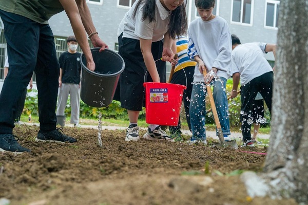 劳动教育活动开始,首先由朱平教授为同学们示范如何松土,同学们认真学习,随后便开始了自行劳作。大家进行分工,彼此合作,男生负责拿着铁锹进行松土,女生负责捡起土壤中的杂物。大家干劲十足,将种子有序地播撒在土壤中,为它们灌溉生命之水。同学们对于本次的劳动教育活动热情高涨,活动过程中无一不露出幸福的笑容。