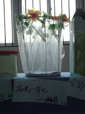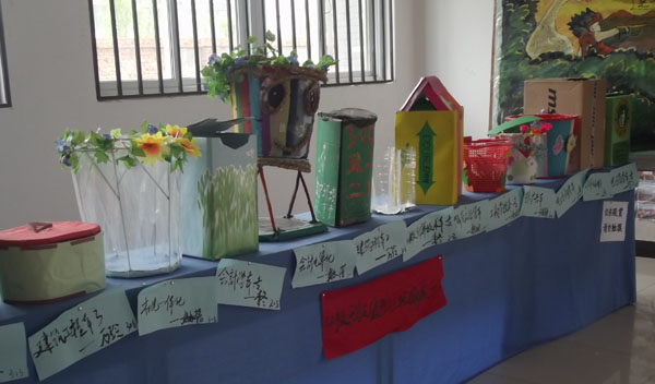 本次设计大赛以“注重节能环保,创建文明高校”为主题,通过利用生活中的废弃物品来制造环保垃圾箱。所展示的垃圾箱主要分为环保型简易垃圾箱和创意型美观垃圾箱,环保型垃圾箱中有的是由铁丝把各类塑料瓶组合成型,有的是用废弃的一次性筷子集扎成箱。创意型垃圾箱中有的是由小铁桶加上废弃木头装成的架子组成,有的是将废弃装修塑料门板组装成“鸟巢”形等,每个垃圾箱的周围都细心地张贴着有关环保的标语标识。