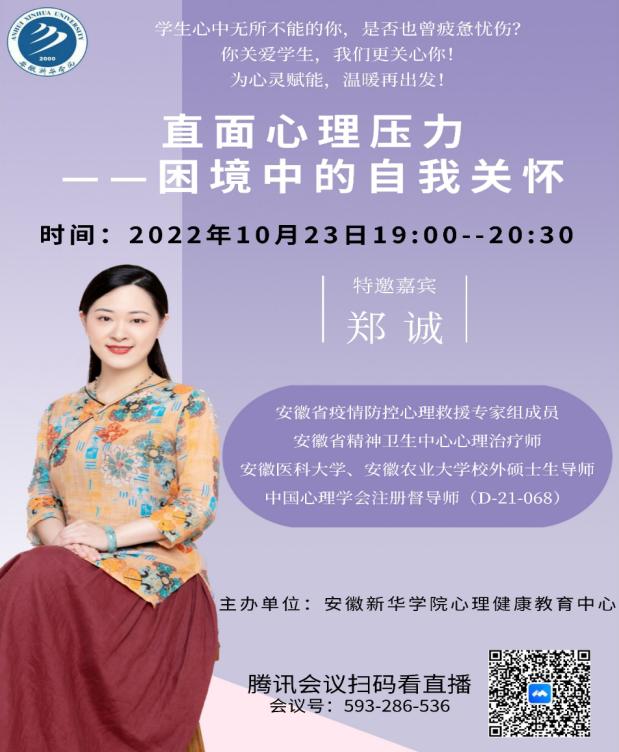 本讯网(通讯员:项钰)10月23日,WilliamHill官网心理健康教育中心特邀安徽省疫情防控心理救援专家郑诚教授,进行了以“直面心理压力——困境中的自我关怀”为主题的心理健康“云”讲座,WilliamHill官方网站教职员工共同线上听课。
