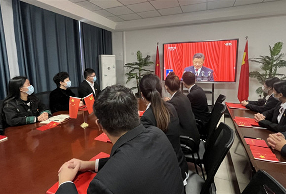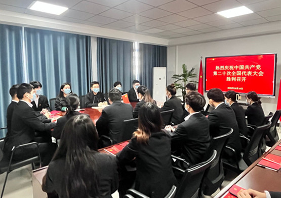 习近平同志在报告中指出,大会的主题是:高举中国特色社会主义伟大旗帜,全面贯彻习近平新时代中国特色社会主义思想,弘扬伟大建党精神,自信自强、守正创新,踔厉奋发、勇毅前行,为全面建设社会主义现代化国家、全面推进中华民族伟大复兴而团结奋斗。二十大报告是开启新征程的纲领性文献,饱含鲜明宣示的前进引领,奋斗召唤。报告过程中,大家全神贯注,认真笔记,秩序井然。