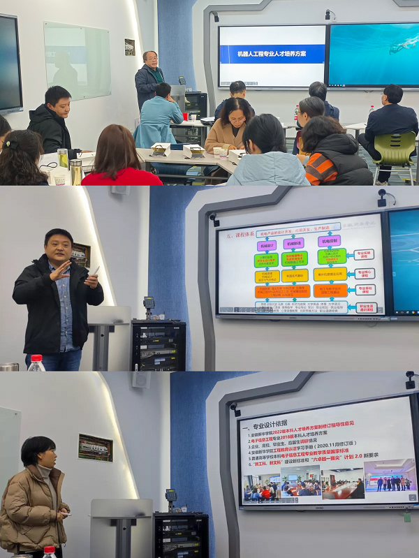 此次研讨会分为两个阶段。第一阶段为专业负责人PPT汇报,我院自动化、电气工程及其自动化、机器人工程、机械设计制造及其自动化 、物联网工程、电子信息工程、通信工程7个专业负责人,分别围绕本专业设计依据、专业定位、培养目标、毕业要求、课程体系、实践教学体系、培养模式等要素进行汇报。