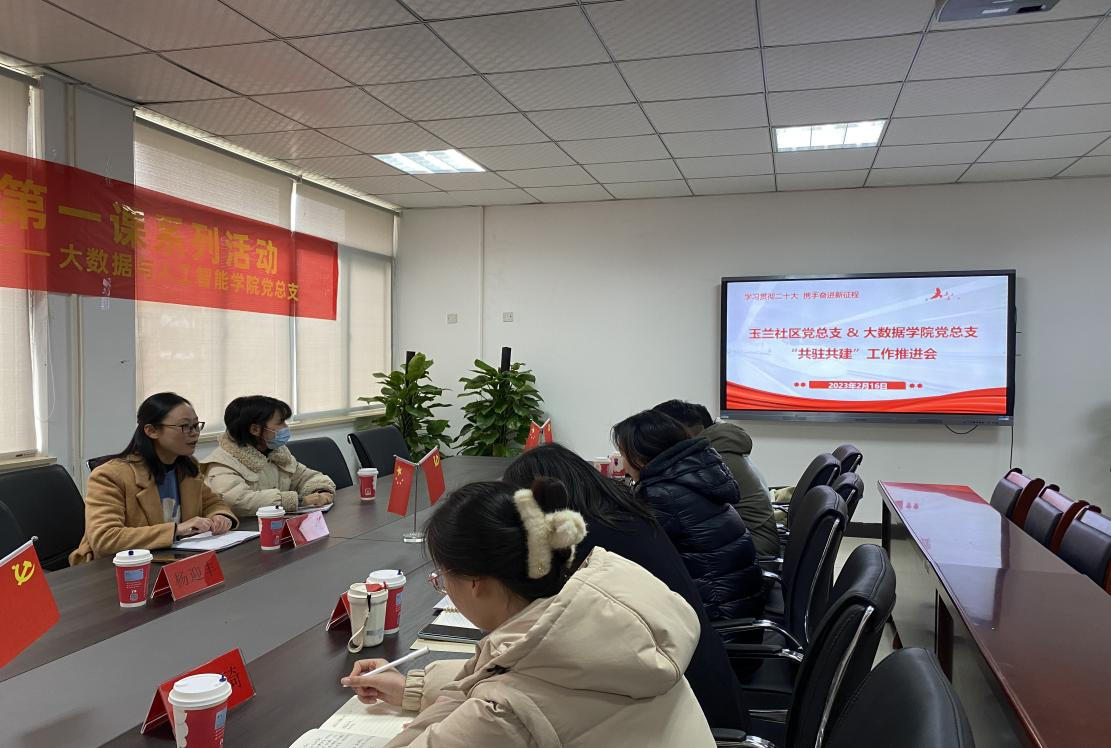 本网讯(通讯员:崔妹)为深入学习贯彻党的二十大精神,把“共驻共建”工作落深落实,2月16日下午在教13 203党员活动室,大数据与人工智能学院党总支与玉兰社区党总支召开了2023年共驻共建工作推进会议。玉兰社区党支部副书记李霞、团支部书记李迎迎、大数据与人工智能学院党总支书记郑妮、副书记魏高莉及党总支所有成员出席此次活动。