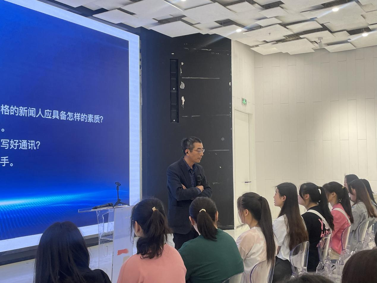 安徽广播电视台特别报道部聂星主任做主题分享。他分别从“为什么学新闻专业”、“新闻的门槛”、“成长为一个合格的新闻人应具备怎样的素质”和“入职记者时,基础的基础是消息的采写”等五个方面来做分享。同时,聂主任向学生们展示了报纸、广播电视和网络新闻内容三者的语言特点和区别,提到了党中央对新闻工作者的要求。他提醒同学们“要树立信心、保持热爱,不要好高骛远。从事新闻工作要脚踏实地,践行‘四力’,用心用情记录新时代。”