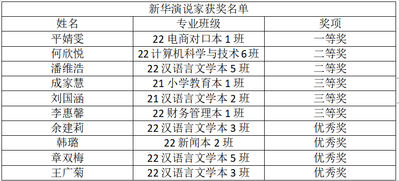 经过激烈的角逐后,平婧雯同学最终夺得桂冠;潘维浩、何欣悦同学获得二等奖;成家慧、刘国涵、李慧馨同学获得三等奖。选手们赛出了风格,赛出了水平,更把握住了锻炼口才、展现自我的机会。此次比赛充分展现了新华学子的飒爽英姿和青春风采,同时也激励了大家朝着正确的方向前行,敢于担当肩上的责任,努力学习、完善自我,将爱国情感化为追求卓越的动力,成为有理想有信念的优秀青年。