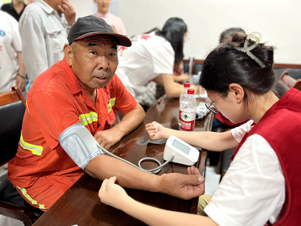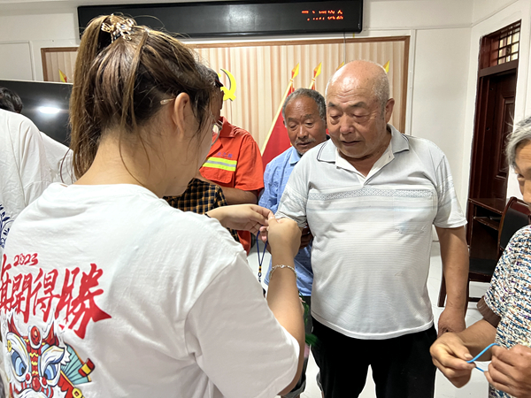 6月29日上午,实践团队开展体质检测、药品安全知识普及、五禽戏教学与食品安全宣传等活动。活动期间实践团队成员详细询问村民身体状况、耐心检查,并检测身高体重、血压及脉搏,检测结束后,实践团队成员将村民体检数据填入健康记录表中,并整理好交给村委会留存。
