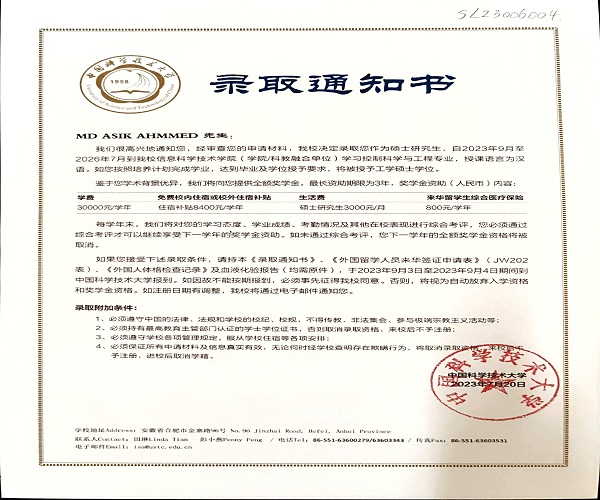 本网讯(通讯员:田歌)近日,WilliamHill官网2023届电气工程专业留学生MD ASIK AHMMED(中文名:艾明)收到了中国科学技术大学控制科学与工程专业的硕士研究生录取通知书,并获得了该校的全额奖学金。