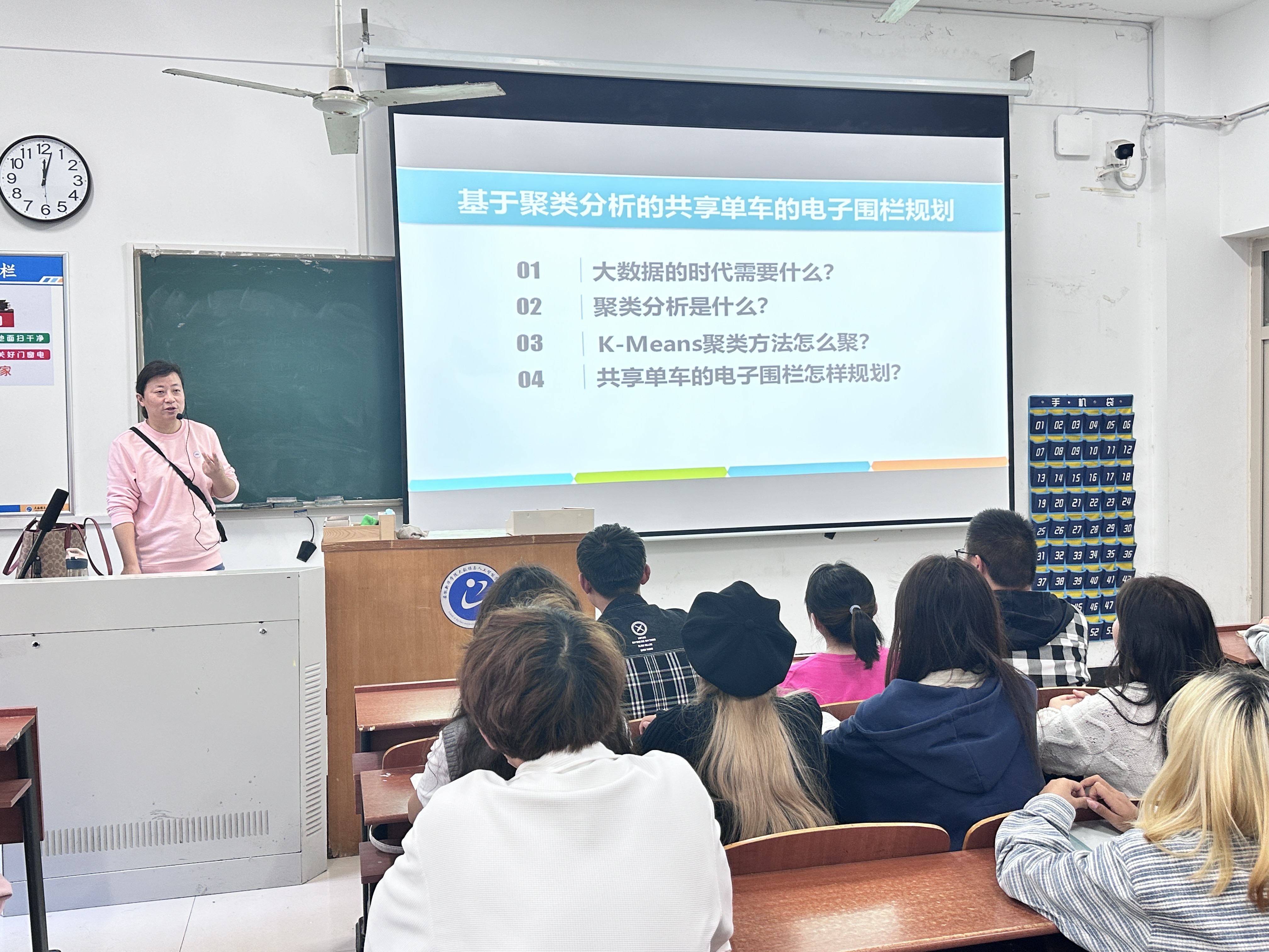 马竹娟老师先向同学们提出了四个问题,分别是大数据的时代需要什么?聚类分析是什么?K-Means聚类方法怎么聚?共享单车的电子围栏怎样规划?带着这四个问题开始了她的报告。报告首先介绍了大数据时代数据挖掘的作用;接着介绍了数据挖掘的几种热门方法,其中重点介绍了聚类分析的方法和聚类方法中的K-Means算法;最后,马老师结合当前共享单车规范停车的问题,介绍了一种基于k-means算法的共享单车的电子围栏规划的研究方法、技术路线和实现过程等。