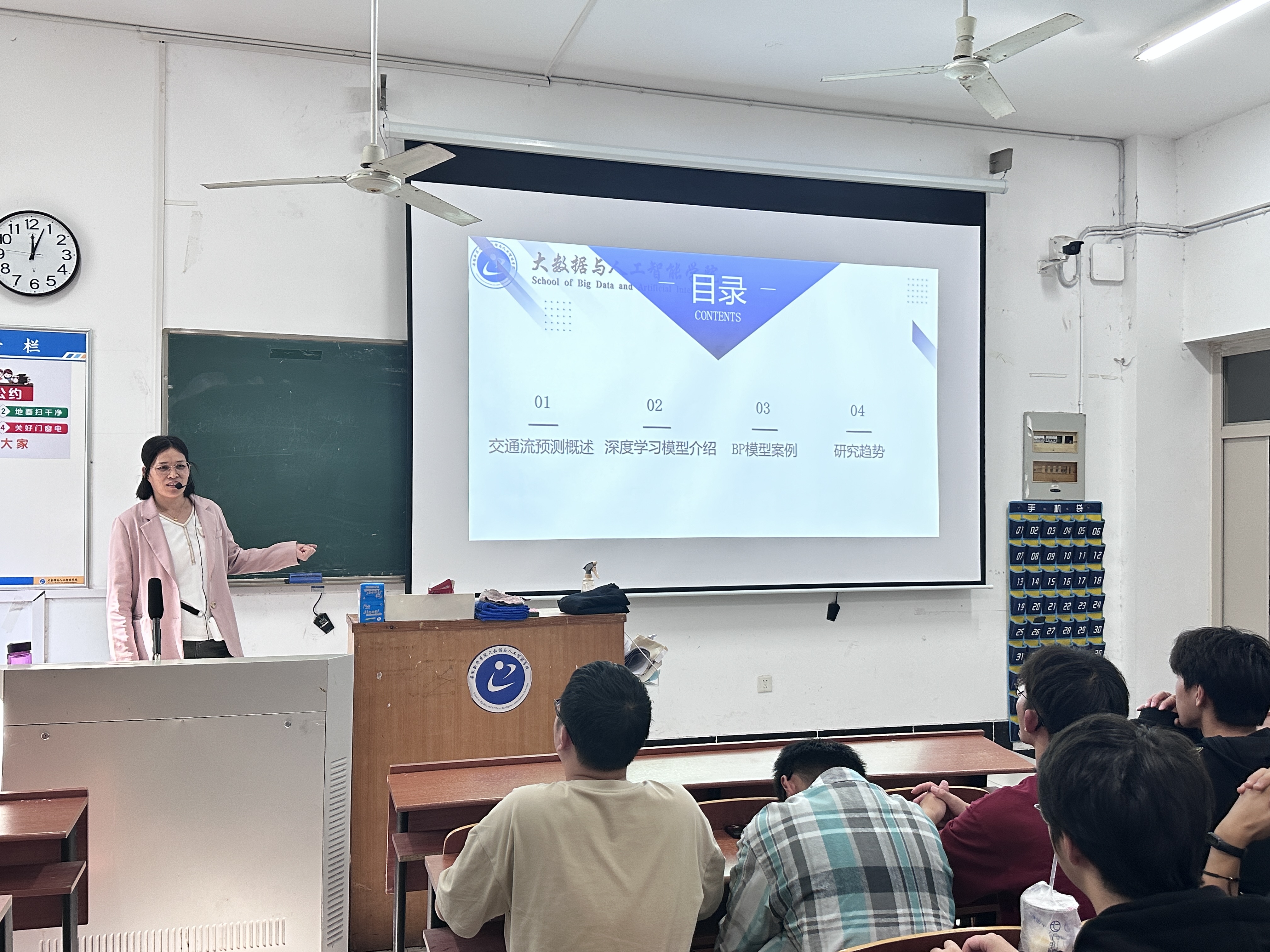 丁春玲老师从交通流预测的背景与意义、常用深度学习模型、短时交通流预测案例分析和总结展望四个方面展开讲述。在介绍研究背景与意义时,主要介绍了智能交通系统应用现状,交通流预测的概念及其对于交通规划和交通诱导的重要性。在讲解常用深度学习模型时,介绍了神经网络、BP神经网络、RNN神经网络和LSTM等几种典型神经网络模型。然后以BP神经网络模型为例分析了短时交通流预测模型的构建和预测过程。最后对短时交通流预测模型构建的一般过程和方法进行总结,并对主要研究方向进行展望。