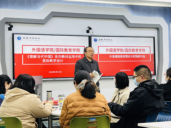 本网讯(通讯员:江雨、张丽)为进一步推进外语课程思政建设,提升教学质量,培养兼具外语专长与家国情怀的高素质人才,外国语学院/国际教育学院于2024年3月13日隆重召开外语课程思政理论与实践研讨会。院长张杰、范东生,院长助理李怡嘉,骨干教师以及近两年新入职的教师参加了本次研讨会。此次研讨会由教师发展中心主任张丽主持。