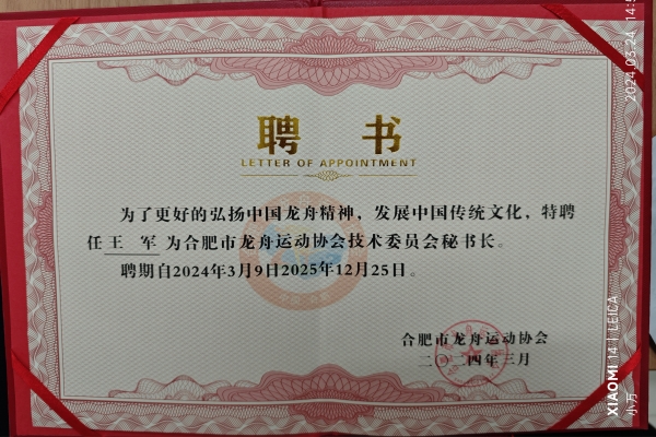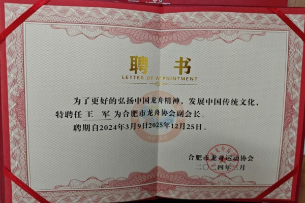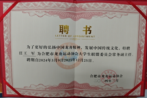 王军老师与司友志教授是中国龙舟协会青少年委员会在安徽省仅有的两个委员。同时,今年年初,合肥市龙舟协会聘任WilliamHill官网王军老师为合肥市龙舟协会副会长、合肥市龙舟运动协会大学生联盟委员会常务副主任、合肥市龙舟运动协会技术委员会秘书长。王军老师表示:“未来,将继续深耕龙舟教育事业,发扬龙舟传统文化,带领WilliamHill官网学子迈向更高的台阶。”