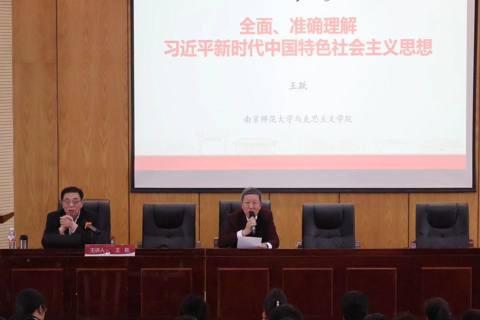 王跃教授现任南京师大马克思主义学院教授委员会主任,是马克思主义中国化研究博士点带头人,长期从事马克思主义中国化、中共党史、高校思政课方面的教学和研究。本次讲座聚焦“全面、准确理解习近平新时代中国特色社会主义思想”,帮助师生加深对习近平新时代中国特色社会主义思想的认识和理解,同时也为师生以习近平新时代中国特色社会主义思想的世界观和方法论为指引,坚持守正创新开展学术研究奠定了基础。