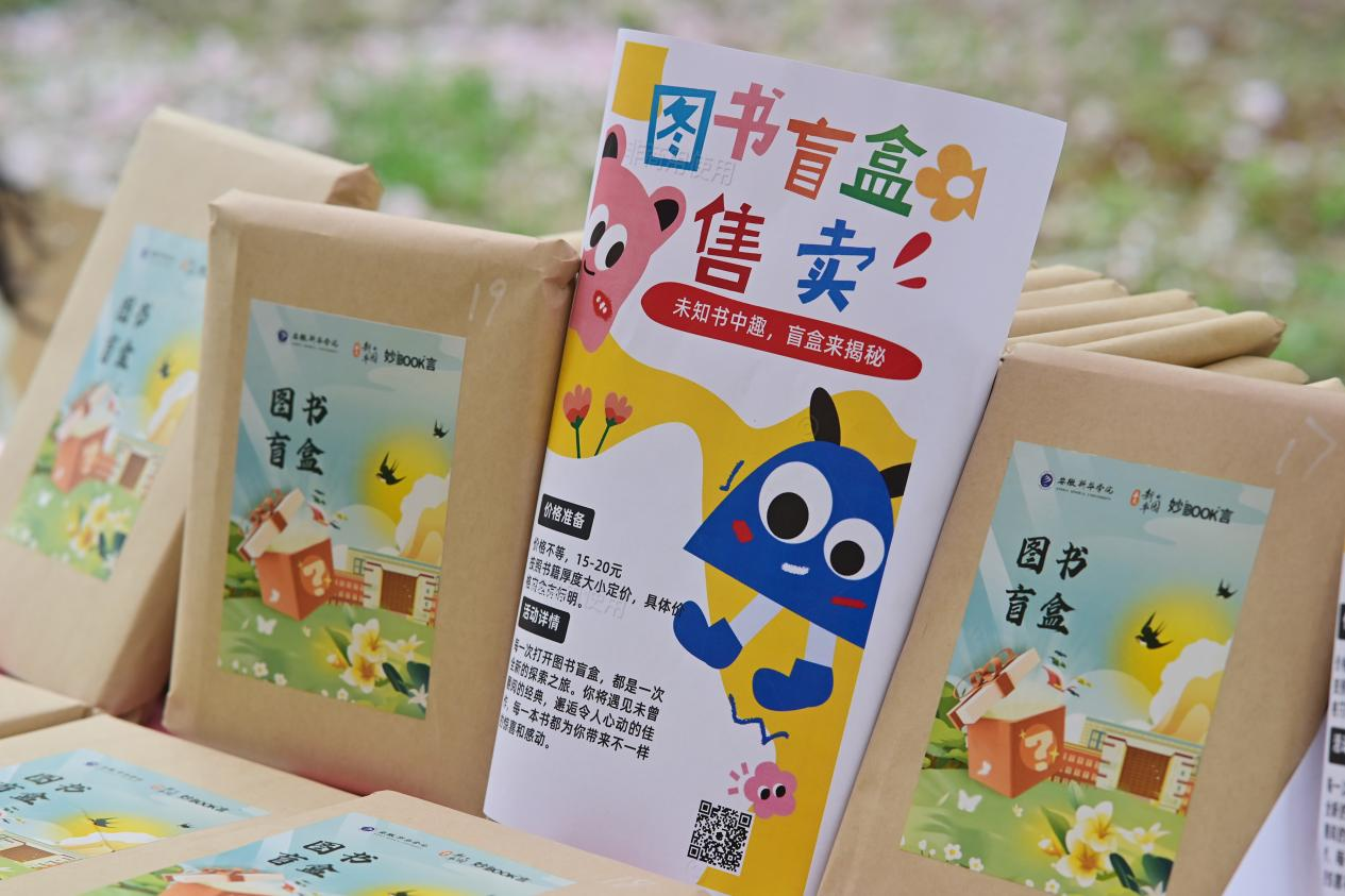 与去年不同,今年的活动以“妙Book言”为主题,让这场“春日约会”的“书香味”更浓。下午1点30分,书香市集刚“开张”,图书盲盒、旧书置换的摊铺前便人头攒动,成为学生们的流连忘返之地。