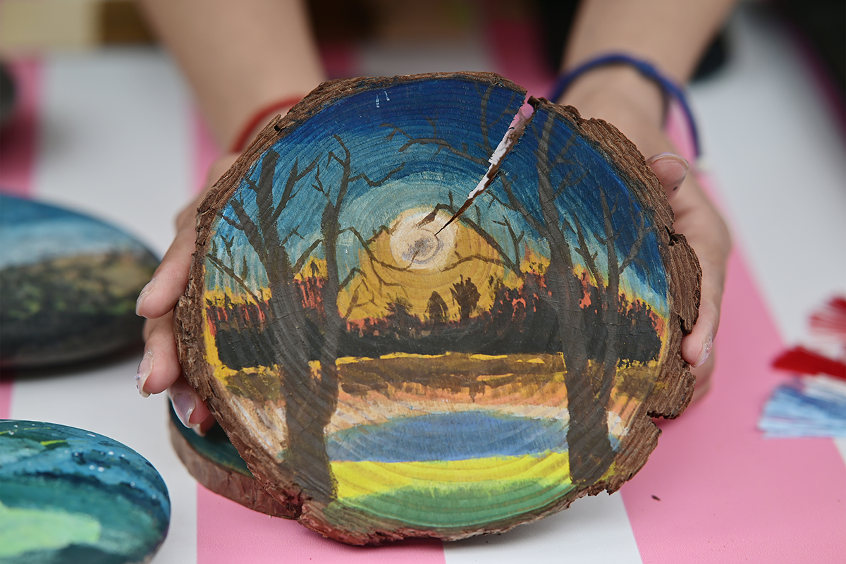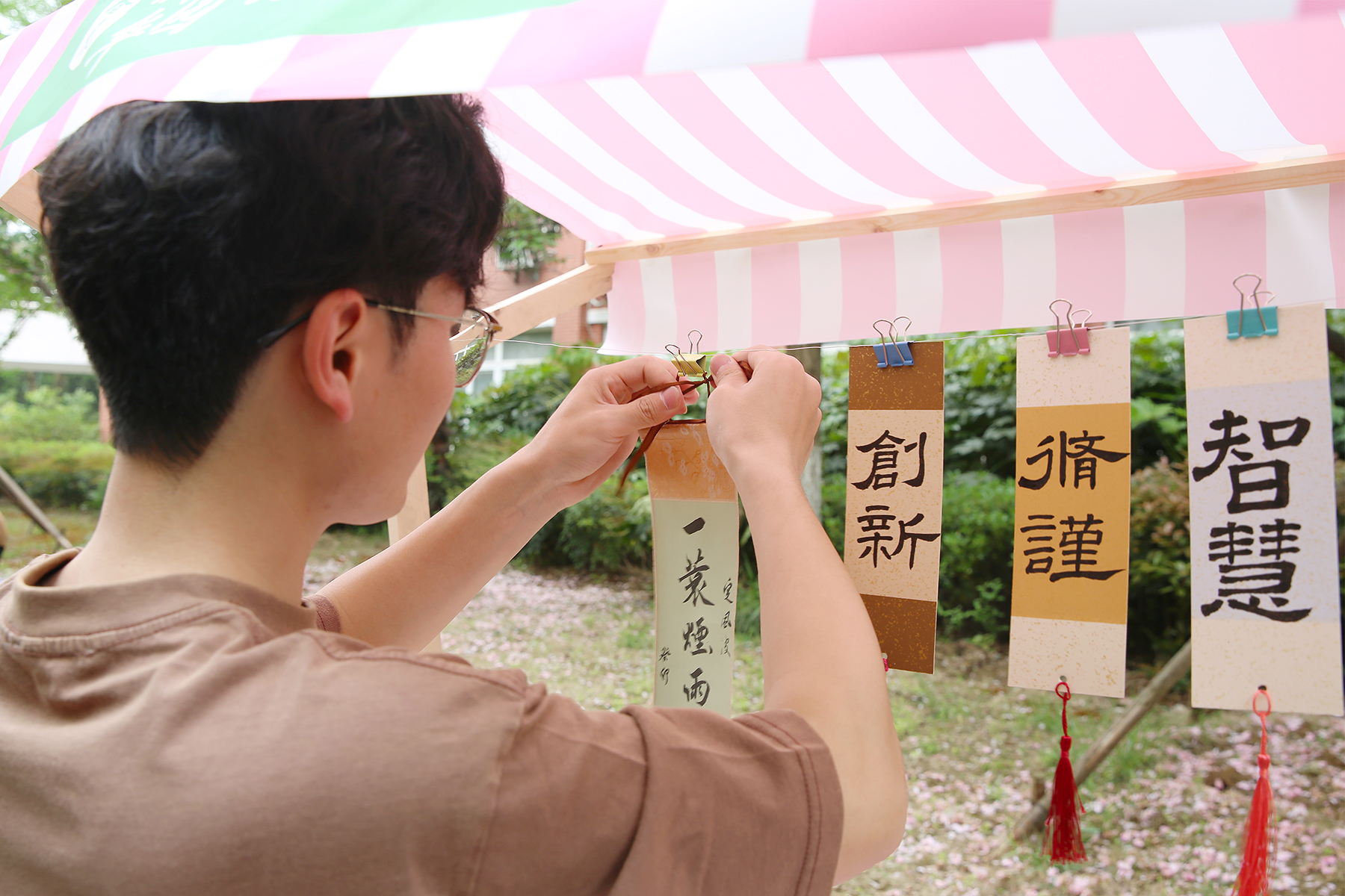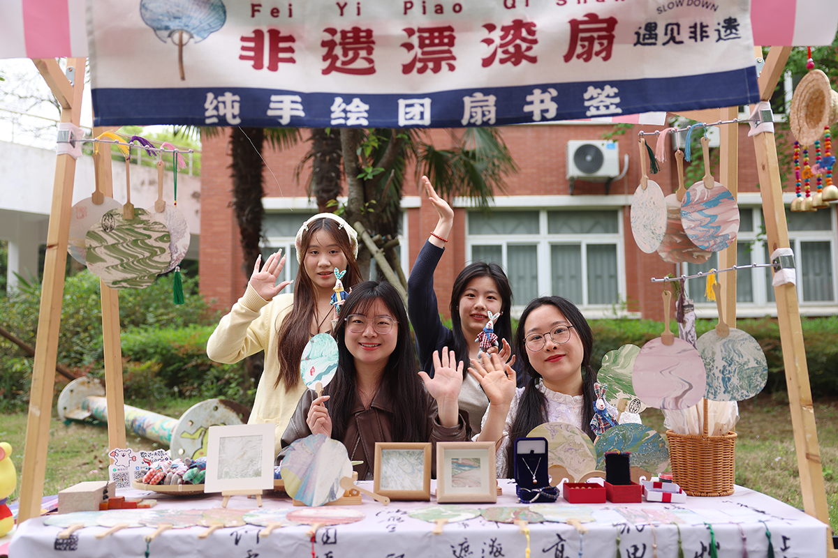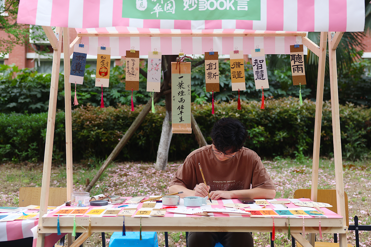 在现场,师生们除了能感受到书香市集浓郁的的书香味,文韵雅集的各类传统文化体验也引来学生们驻足和参与。现场搭建古风建筑模型,沉浸体验茶百戏,绘制团扇、书签……各类学生社团还将飞花令、射箭、投壶、古风桌游等多种传统文化体验活动“搬”到了樱花树下。
