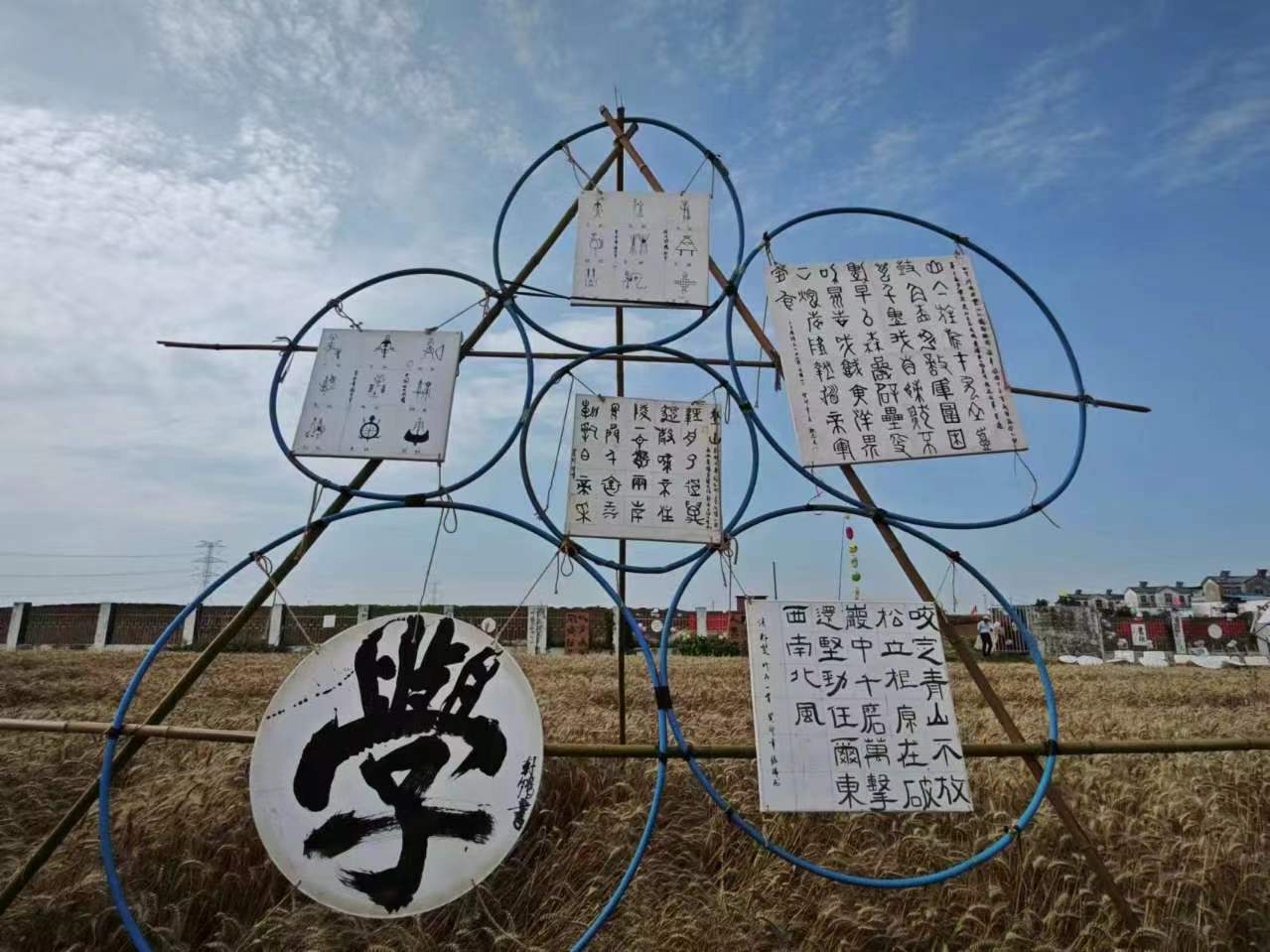 “麦田书法展”是由校长吴硕勇发起的劳育与美育的融合成果,设计理念是将学校麦田的小麦设计成“中”字形,两旁悬挂学生的篆书、楷书、行书、隶书及乡村文化的绘画作品,体现了艺术在农耕文明基础上的活力。本次活动教育系选出37幅学生书画作品,2幅教师作品参展,选派7名志愿者参加书法布展,进一步助力乡村教育的发展。同时,恰逢“六一”期间文艺活动,2023级学前教育专业的张思怡,史涵琪,蒋瑞晴,田欣悦四名同学带去的《舞绘芳华》舞蹈表演,获得在场教师、同学们的一致好评,展现了新华学子的精神面貌。