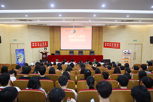 李萱警官为大家讲解了她们破获的诈骗案例以及在高校学生中常发的电诈案例类型,希望同学们引以为戒。活动现场气氛活跃,农行的工作人员还为同学们带来精美的礼品。