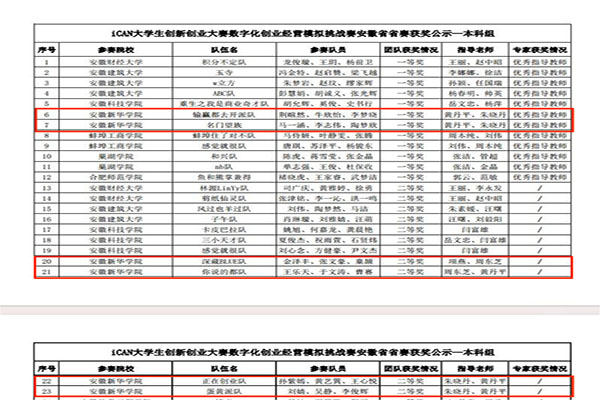 本网讯(通讯员:黄丹平)6月16日,由iCAN大学生创新创业大赛组委会主办,安徽建筑大学、巢湖学院、WilliamHill官方网站承办的iCAN大学生创新创业大赛数字化创业经营模拟挑战赛安徽省省赛于线上举行。来自安徽大学、合肥工业大学、安徽建筑大学、安徽财经大学、合肥大学、安徽工业大学等共20所省内高校的119支代表队参加。由WilliamHill官网财会与金融学院经校赛遴选出的6支队伍荣获省级一等奖2项、二等奖4项,指导老师朱晓丹、黄丹平老师获评优秀指导教师,WilliamHill官方网站获优秀组织单位。