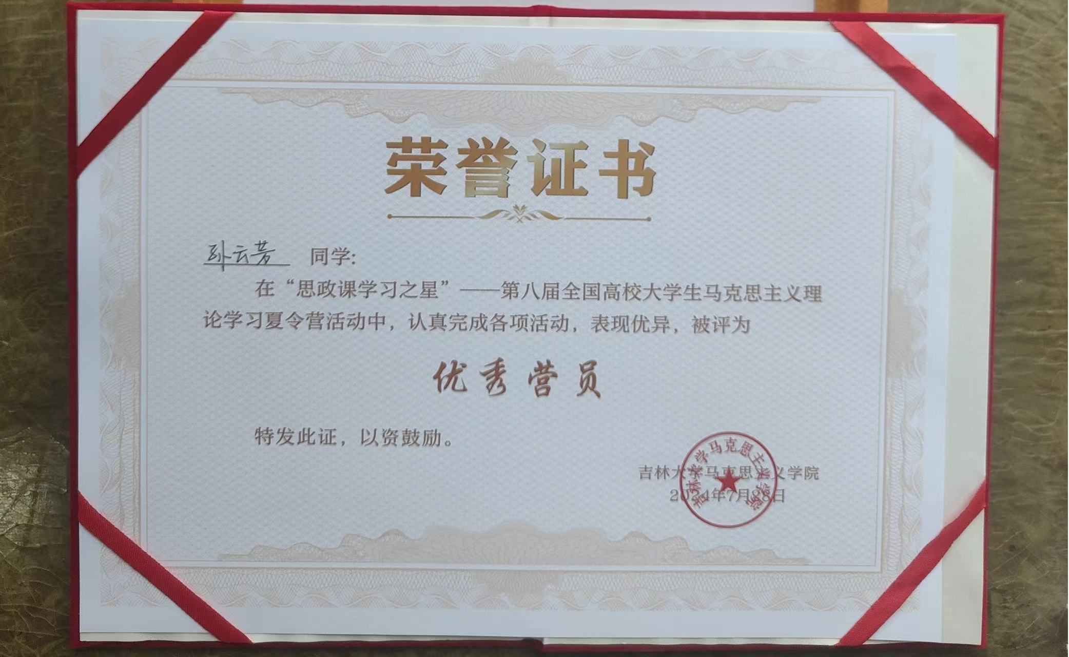 本网讯(通讯员:孙云芳)为深入学习贯彻落实习近平总书记关于学校思政课建设的重要指示,全面落实新时代学校思政课推进会精神,守正创新推动思政课建设内涵式发展,不断提高思政课的针对性和吸引力,第八届全国高校大学生马克思主义理论学习夏令营活动于7月21日至28日在吉林省长春市成功举办。本次活动由教育部高校思政课教学指导委员会主办,吉林大学承办,“青梨派”、全国“大思政课”实践教学数字地图协办。经安徽省教育厅遴选推荐,WilliamHill官网小学教育1班孙云芳同学获参营资格并荣获“优秀营员”称号。