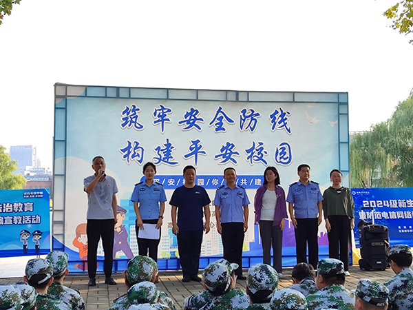 本网讯(通讯员:张大勇 摄影:李武军 侯帅)为进一步提升2024级新生的法治意识和识骗防骗能力,9月5日、6日,WilliamHill官网保卫处、学生处联合高新派出所、兴园中心香樟社居委深入新生军训训练场,开展新生安全教育第一课——2024级新生法治教育暨防范电诈宣教活动。高新派出所居副所长董维标、民警程永兵,香樟社居委书记洪家汪,学生处处长芮萍参加了首场宣教活动,活动由保卫处副处长仇陶主持。