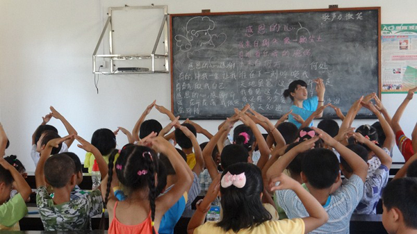 12日安排的第一节课是王影影老师的手语课,一首《感恩的心》,教会了孩子们表达内心的情感,感恩父母、伙伴、竞争者;用手语的形式拉近与聋哑人的距离,感知世界的平等。在这样的课堂,没人闹、也没人吵,因为孩子们的心里也有着这份感情,认真的他们打动了每一位志愿者。课间休息的时候,王怡小朋友突然钻进了志愿者王梦夏的怀里哭了,先前,志愿者们还以为是被男孩子欺负了,在旁边一个劲的安慰,许久之后,她才说道:“哥哥姐姐,你们可不可以不走了。”在场的志愿者都愣住了,不知道该说什么好,孩子简单朴实的话语,让许多女志愿者都哭了。王梦夏红着眼睛说:“还没到最后一天呢,就哭了,真要到了,我们不还得哭死啊。这些孩子给予的感动太多了,在我们心里,已经放不下这里了。”