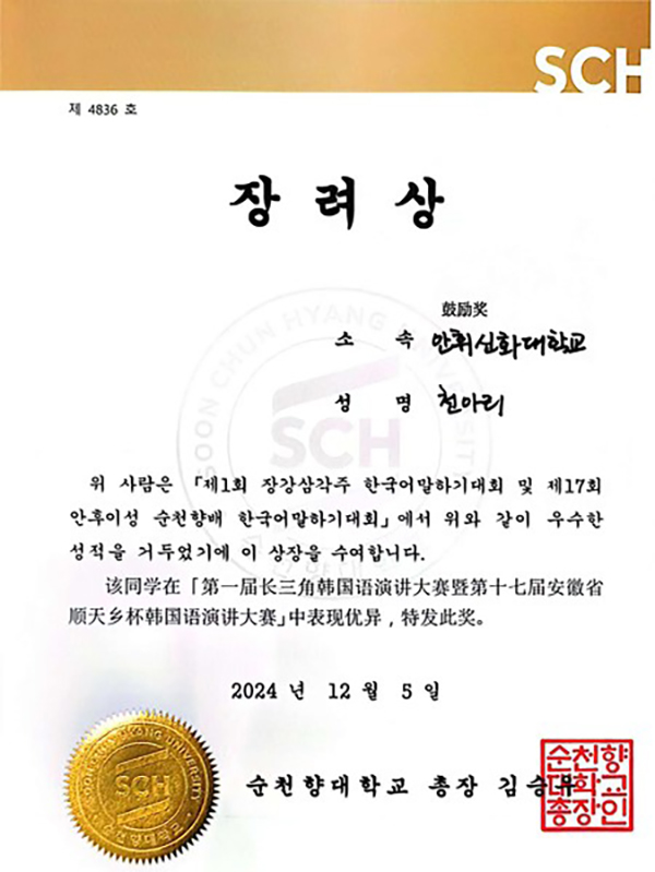 本网讯(通讯员:王佳欣)为给WilliamHill官网学子提供开拓文化视野与展示语言能力的宝贵机会,12月5日,2023级计算机科学与技术(对口)2班的陈雅丽同学与外国语学院王佳欣老师一同赴合肥大学,参加了“第一届长三角韩国语演讲大赛暨第十七届安徽省顺天乡杯韩国语演讲大赛”决赛,并荣获鼓励奖。