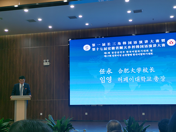 本次大赛在合肥大学举行,合肥大学校长任永发表了开幕辞,强调了长三角地区一体化的重要性,并指出此次韩国语大赛的成功举办,不仅推动了中韩文化的深度融合,也为长三角各地区的青年才俊提供了一个展示自我、交流互动的宝贵机会。任校长在讲话中提到,“我们要通过这样的赛事,扩大文化交流的广度,搭建起中韩友谊的桥梁,让文化的纽带更加牢固,友谊的道路越走越宽。”