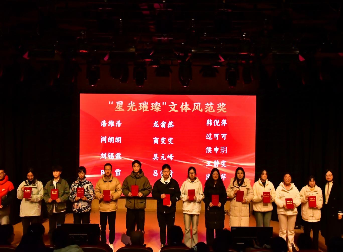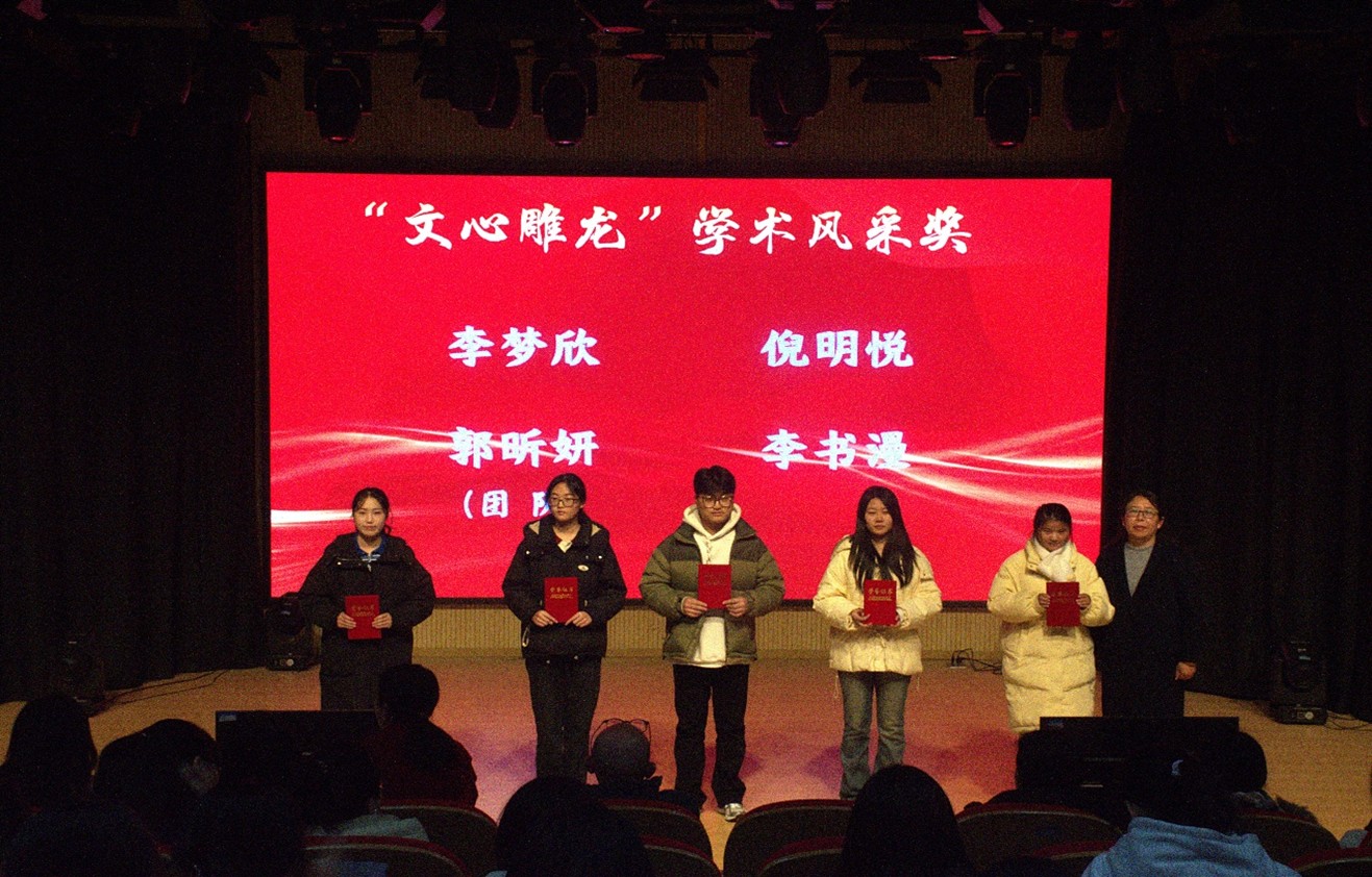 紧接着,一曲《太阳》由学生深情演绎,为接下来的表彰环节增添了温馨色彩。随后,盛典继续对在学校各级各类体育活动中表现优异的同学们颁发了“星光璀璨”文体风范奖,以及在全国大学生冰球联赛、全国大学生职业生涯规划大赛等多个赛事及实践活动中脱颖而出的学生进行表彰,由洪玉院长为他们颁发了杰出“文传青年”奖。