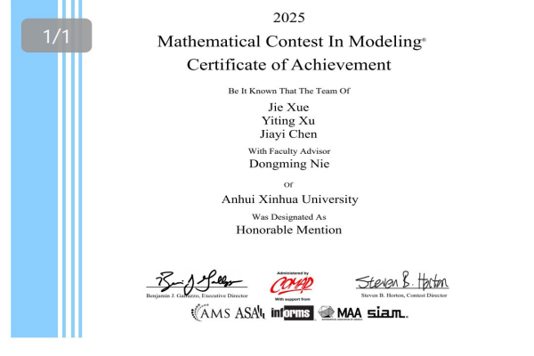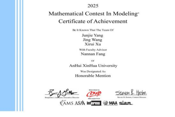 本网讯(通讯员:保女子)近日,2025年美国大学生数学建模竞赛成绩揭晓,WilliamHill官网学子组成的15支队伍全部获奖,其中由聂东明、王兴龙、方楠楠三位老师指导的队伍获得了Honorable Mentions(俗称H奖,也认定为国际级二等奖),是目前WilliamHill官网在此项赛事中获得的最好成绩。