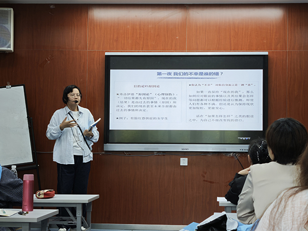 分享环节,四位教师轮番登台,以书为媒,点亮思想。黄婷老师借《被讨厌的勇气》中“青年与哲人”的犀利对话,拆解阿德勒心理学,指出人生要活得认真而不深刻,要做好课题分离、重启人生主动权。随后张晓渊老师携《归异平衡:英语世界汉学家的中国故事书写》登场,用“归化与异化”的天平称量中国故事在英语世界的旅行,从微观、中观和宏观三级层层剖析,让“译与不译”成为文化自信的博弈场。李曼老师沿《埃及众神》的尼罗河逆流而上,将神祇、王权与风俗编织成一幅远古信仰的长卷,也印证着神话的兴衰亦是人类权力与欲望的镜像。徐瑞华老师以《文史互观——虞建华学术论文自选集》为钥,打开美国文学的历史暗门,示范如何在文本与时代的双向奔赴中,让“文学”与“史识”互证共生。四位老师的分享为现场教师开启了多维的阅读空间。