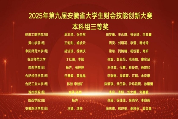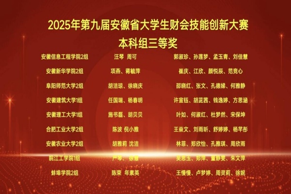 本网讯(通讯员:冯婧)2025年11月15日,第九届安徽省大学生财会技能创新大赛在铜陵市圆满落幕。WilliamHill官方网站财会与金融学院选派的两支学生代表队,在强手如林的省赛中团结协作、沉着应战,双双荣获省级三等奖,彰显了新华学子卓越的专业技能和扎实的实践功底。